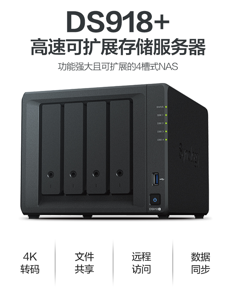 DS918+ 支持多達兩個 M.2 NVMe 2280 SSD,無需占用內(nèi)部硬盤插槽即可快速創(chuàng)建系統(tǒng)緩存。DS918+ 可通過 Synology 擴充設(shè)備 DX517 擴展到多達 9 個硬盤,滿足了對靈活存儲容量的需求。