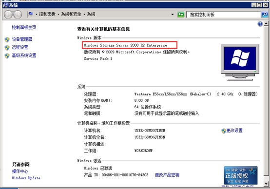 我的電腦右鍵點擊屬性,發(fā)現系統已變成Windows Storage Server 2008 R2,成功將Windows Server 2008 R2轉換。